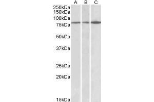 Western Blot: Approx 75-80 kDa band observed in Human and Mouse Brain lysates (calculated MW of 75.8 kDa according to Human NP_001035374.2 and 74.2 kDa according to Mouse NP_001157969.1). Recommended concentration: 0.3-1 μg/mL. Primary incubation was 1 hour.