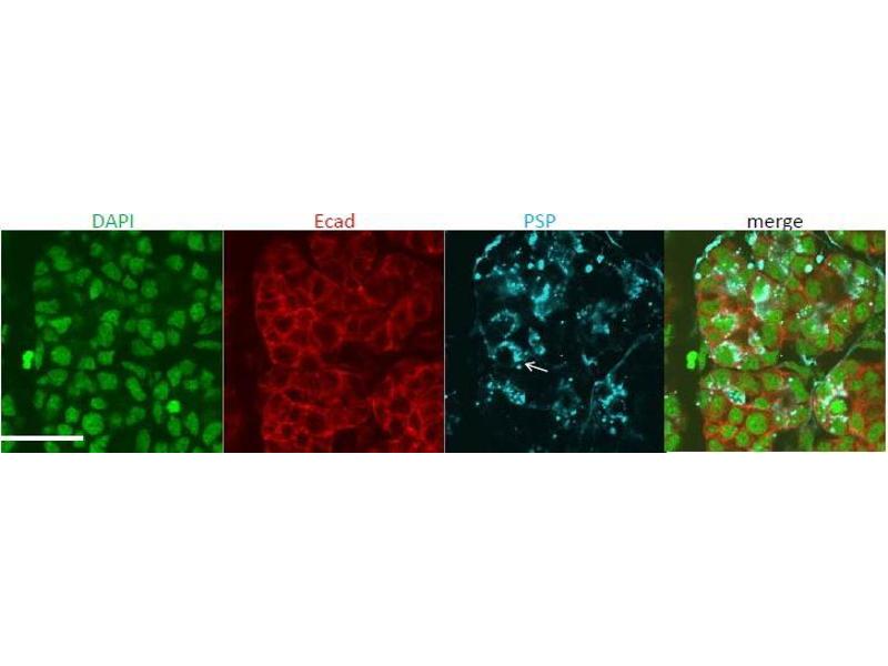 Immunocytochemistry: A subset of murine submandibular gland cells (E18) show specific staining in secretory granules. Recommended concentration 4ug/ml. Data provided by Everest Grant winner Melinda Larsen, State University of New York, Al