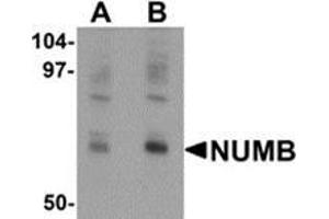 NUMB, the mammalian homolog to the Drosophila asymmetric cell fate determinant NUMB, is thought to share several features molecular mechanisms in mammalian cells, generating asymmetric cell divisions during neurogenesis in vertebrate development as well as in hematopoietic stem cells (1,2). NUMB has been shown to inhibit Notch signaling, and is itself regulated by ubiquitinylation by MDM2. NUMB has also been shown to help activate the tumor suppressor p53, suggesting that loss of NUMB in cancerous cells would not only activate the potential oncogene Notch, but diminish the tumor suppressing effect of p53.Synonyms: Protein S171, Protein numb homolog, h-Numb