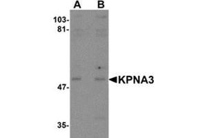 Karyopherin, a cytosolic and heterodimeric protein complex consisting of alpha and beta subunits, is responsible for targeting proteins with nuclear localization signals to the nuclear pore complex by an energy requiring, Ran-dependent mechanism. The alpha subunit and imported substrate enter the nucleus and accumulate in the nucleoplasm, while the beta subunit accumulates at the NPC. KPNA3, the alpha subunit 3 of karyopherin, is silimar to human KPNA2, suggesting that KPNA3 may be involved in the nuclear transport system. It is ubiquitously expressed and recent studies have shown that human KPNA3 may be associated with schizophrenia.Synonyms: Importin alpha Q2, Karyopherin subunit alpha-3, QIP2, SRP1-gamma