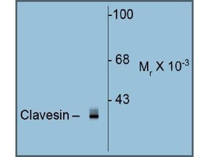 - Specific for the ~35 kDa Clavesin 1/2 protein doublet in Western blots of Rat brain lysate. Isoform-specific knock down in cultured hippocampal neurons indicates that the lower and upper bands are Clavesin 1 and 2, respectively.