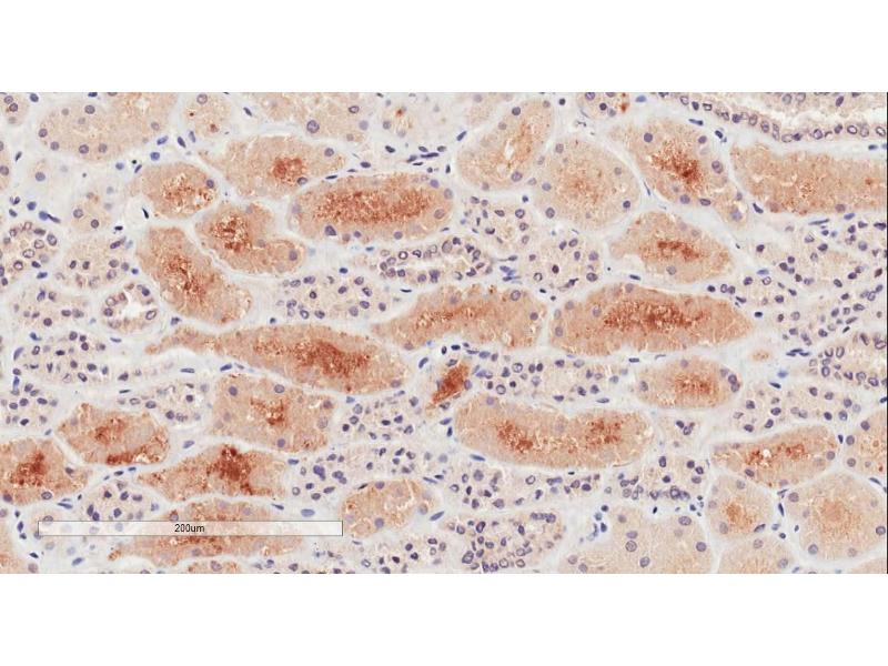 Immunohistochemistry: In paraffin embedded Human Kidney shows staining of brush borders in select PCT. Recommended concentration: 2-4 μg/mL. Paraffin embedded Human Prostate. Recommended concentration: 10 μg/mL.
