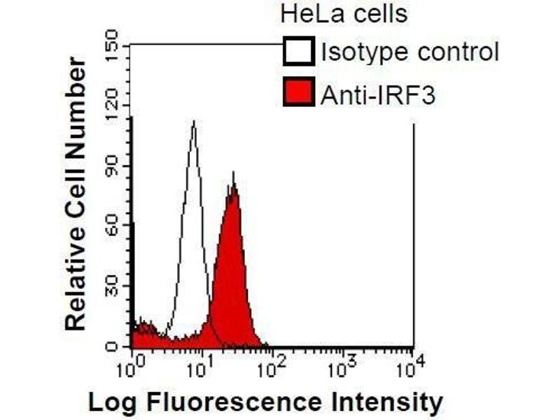 IRF3 encodes interferon regulatory factor 3, a member of the interferon regulatory transcription factor (IRF) family. IRF3 is found in an inactive cytoplasmic form that upon serine/threonine phosphorylation forms a complex with CREBBP. This complex translocates to the nucleus and activates the transcription of interferons alpha and beta, as well as other interferoninduced genes. Synonyms: Monoclonal IRF3 antibody, Anti-IRF3 antibody, Interferon regulatory factor 3 antibody.