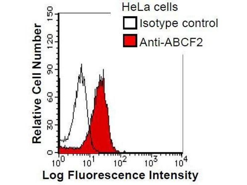 The protein encoded by this gene is a member of the superfamily of ATP-binding cassette (ABC) transporters. ABC proteins transport various molecules across extra- and intracellular membranes. ABC genes are divided into seven distinct subfamilies (ABC1, MDR/TAP, MRP, ALD, OABP, GCN20, and White). This protein is a member of the GCN20 subfamily. Alternative splicing of this gene results in multiple transcript variants. Synonyms: Monoclonal ABCF2 antibody, Anti-ABCF2 antibody, ATP-binding cassette sub-family F member 2 antibody, ABC28 antibody, M-ABC1 antibody, HUSSY-18 antibody, EST133090 antibody, DKFZp586K1823 antibody.