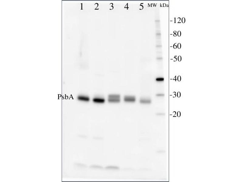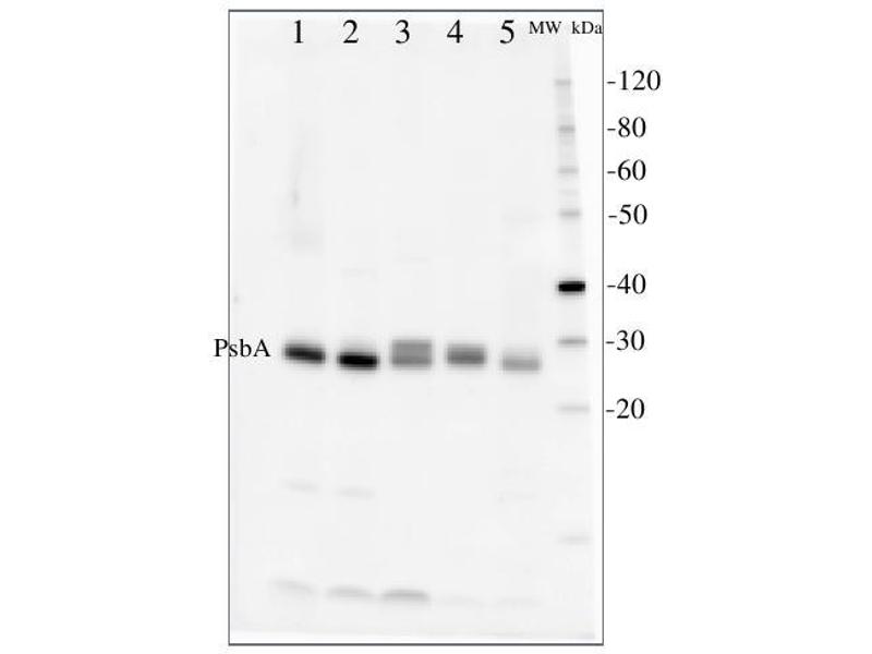 A number of degradation products may be observed when using anti-PsbA antibodies, including products having apparent molecular weights of 24kDa and16kDa. D1 degradation is a complex set of events and the products observed can be influenced by both the extraction procedure and the physiology of the cellsprior to harvest. Third, cross-linking may occur between D1 and cytochrome b559,shifting the protein higher in the gel. In cyanobacteria (PCC7942), three different bands were competed out by preincubating the antibody with the PsbA free peptide, indicating that all bands are indeed PsbA and its precursors or breakdown products. Competition assays were also performed with spinach and Chlamydomonas, confirming the identity of PsbA bands. Anti-PsbA antibodies willnot detect D2 protein, as the peptide used to generate PsbA antibodies has no homology to the D2 sequence. -