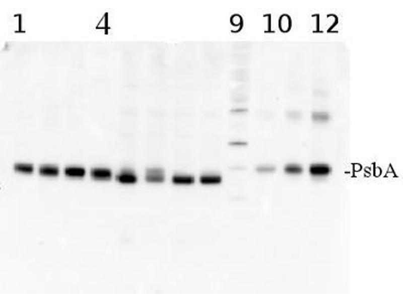 The PsbA (D1) protein of Photosystem II is rapidly cycled under illumination in all oxygenic photobionts. Disruption of PsbA cycling or losses of PsbA pools are central to photoinhibition of photosynthesis in cyanobacteria, algae and plants under a wide range of conditions including excess light, low temperature and UV exposure. Tracking PsbA pools using the Global PsbA antibody can show the functional content of Photosystem II in a wide range of samples. -