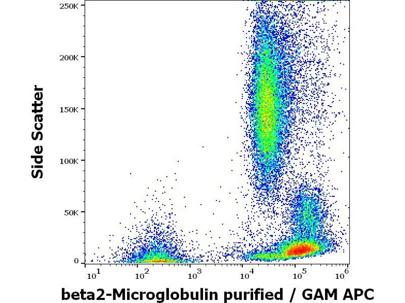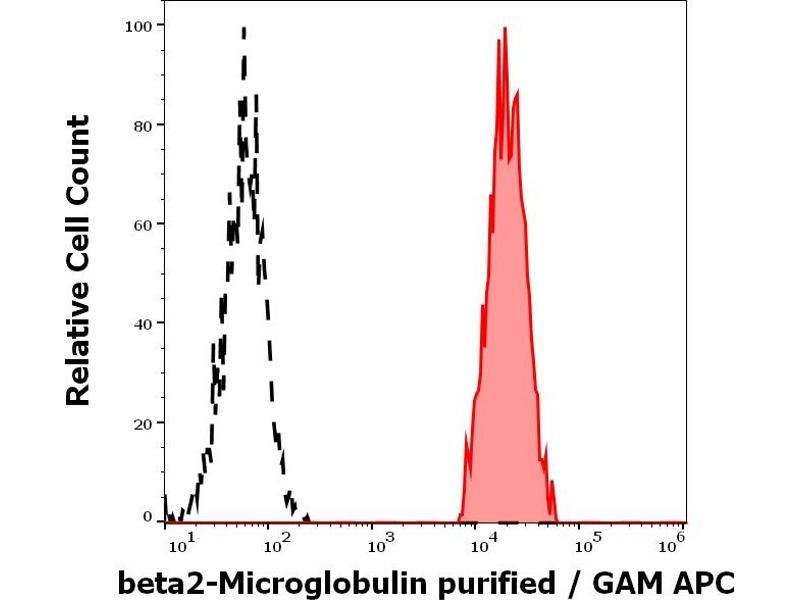 Western blotting: Recommended dilution: 2-4 μg/mL, positive control: U937 human histiocytic lymphoma cell line, RAJI human Burkitt lymphoma cell line, negative control: EL4 mouse lymphoblastic lymphoma cell line, both reducing and non-reducing conditions. Immunohistochemistry (paraffin sections): Recommended dilution: 10 μg/mL, positive tissue: kidney glomeruli. Flow cytometry: Recommended dilution: 0.5-4 μg/mL, positive control: peripheral blood lymphocytes, negative control: DAUDI human Burkitt lymphoma cell line, erythrocytes. ELISA: Working dilution should be determinated by investigator. RIA: Use at an assay dependent concentration. The dissociation constant of the antibody soluble beta2-microglobulin is 1.5 x 10-8 mol/l as determined by competitive RIA. Immunoprecipitation: The antibody B2M-01 coprecipitates beta2-microglobulin (12 kDa) and HLA antigens (45 kDa) from the lysates of human lymphoid cells.