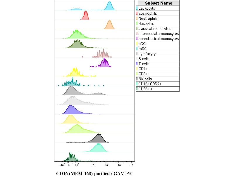- The antibody MEM-168 reacts with an extracellular epitope of CD16 antigen, a low affinity receptor for aggregated IgG (FcgammaRIII antigen). CD16 exists in two different isoforms: CD16a (FcgammaRIIIA, 50-65 kDa, expressed on NK-cells, monocytes and macrophages) and CD16b (FcgammaRIIIB, 48 kDa, mainly expressed on neutrophils).