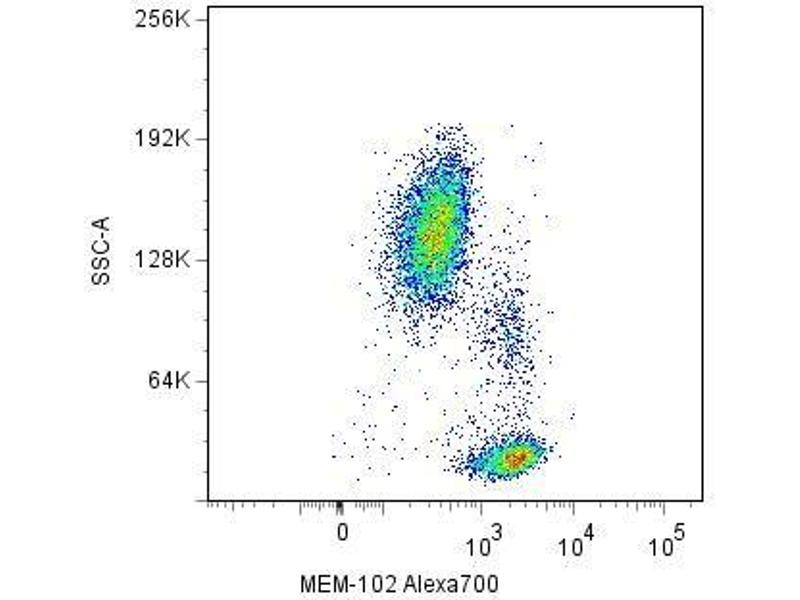 The antibody MEM-102 reacts with CD48 (Blast-1), a 40-47 kDa GPI-anchored extracellular membrane protein (immunoglobulin supergene family) widely expressed on hematopoietic cells, it is negative on granulocytes, platelets and erythrocytes.