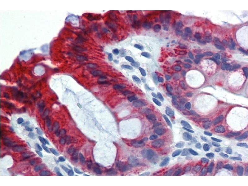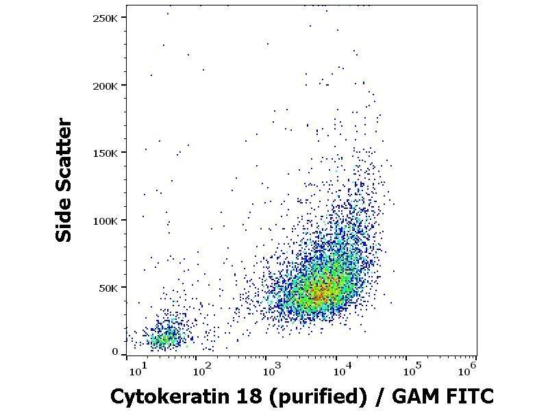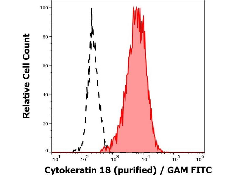 Western blotting: Recommended dilution: 1-2 μg/mL. Immunohistochemistry (paraffin sections): Recommended dilution: 10 μg/mL, positive control: colon, kidney. ELISA: The antibody C-04 has been tested as the capture antibody in a sandwich ELISA for analysis of cytokeratin 18 in combination with the antibody DA-7 (cat. no. 1B-110-C100) and with the antibody DC-10 (cat. no. 1B-107-C100). Flow cytometry: Recommended dilution: 1-4 μg/mL. Intracellular staining.