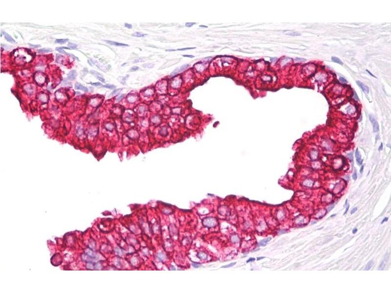 Immunohistochemistry (paraffin sections): Recommended dilution: 10 μg/mL, positive control: human prostate.