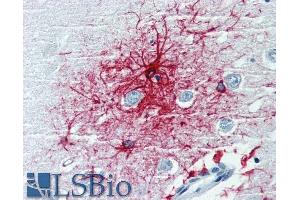 Immunohistochemistry (paraffin sections): Recommended dilution: 10 μg/mL, positive tissue: human brain (cortex, cerebellum). The antibody GF-01 strongly stains astrocytes in human brain tissue sections but it is essentially negative on mouse and rat tissues.