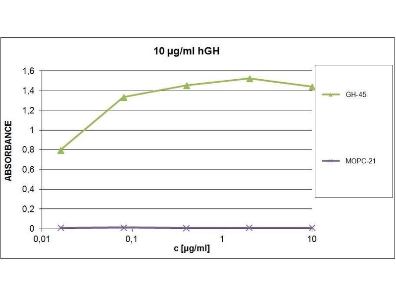 - The mouse monoclonal antibody GH-45 recognizes human growth hormone (hGH), a polypeptide hormone synthesized by acidophilic or somatotropic cells of the anterior pituitary gland. The GH-45 antibody reacts with affinity constant 3.8 x 1010 l /mol, it does not bind human prolactin or any other pituitary hormones.