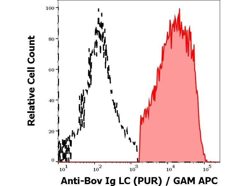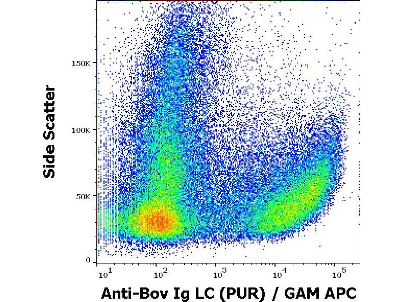 Western blotting: Recommended dilution: 0,5-1 μg/mL, overnight at 4 °C. Sample preparation: bovine serum, dilution 1:50 in Laemmli reducing buffer, boiled in water bath for 3 min. Reducing conditions, 12 % separating gel. The antibody strongly reacts with bovine IgG light chains, weakly reacts with IgM. Flow cytometry: Recommended dilution: 1-4 μg/mL