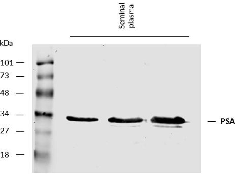 The mouse monoclonal antibody A67-B/E3 reacts with prostate-specific antigen (PSA), a protein produced by normal prostate cells. The highest amounts of PSA are found in the seminal fluid. This antibody recognizes both free and complexed PSA.
