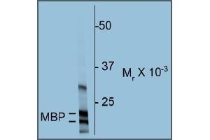 Myelin Basic Protein (MBP) is one of the major proteins of the myelin sheath surrounding axons in the nervous system. Since it is of relatively low molecular weight and high abundance the protein sequence was determined from purified protein over 30 years ago (Eylar et al., 1971). The protein is made by oligodendrocytes in the central nervous system, so antibodies to MBP are good markers of this cell type. However, transcripts from the same gene are also expressed in certain hematopoetic lineage cells (Marty et al., 2002). In the central nervous system there are there different forms of the protein made by alternate transcription from a single gene, which have molecular weights of 21.5, 18.5, and 17.2 kDa. Since the two lower molecular weight forms are very close in molecular size, MBP antibodies typically show two bands on Western blots, one at about 22 kDa and another at about 18 kDa.Synonyms: MBP, Myelin membrane encephalitogenic protein