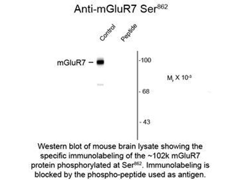 - Specific for the ~102k mGluR7 protein phosphorylated at Ser862. Immunolabeling is blocked by preadsorption of antibody with the phospho-peptide used as antigen but not by the corresponding dephosphopeptide.