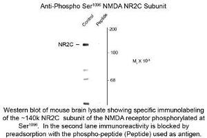 - Specific for the ~140k NR2C subunit of the NMDA receptor phosphorylated at Ser1096. Immunolabeling is blocked by preadsorption of antibody with the phospho-peptide that was used to generate the antibody but not by the corresponding dephospho-peptide.
