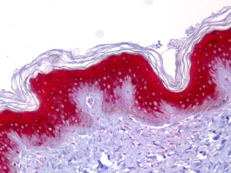 - Recognizes human involucrin, a 585 amino acid soluble protein encoded by the IVL gene and expressed in epidermal keratinocytes as they tend towards terminal differentiation. Involucrin is produced in the stratum spinosum initially in the cell cytosol from where it moves to the cell membrane, associates with transglutaminase and becomes cross-linked to membrane proteins, offering structural support to the cell and forming a stable envelope below the plasma membrane. Recognizes an epitope between residues 421-568 of human involucrin. Involucrin expression is seen in the normal granular cells of the epidermis associated with the plasma membrane during the early phase of cornified envelope maturation and expression is increased in psoriatic epidermis with abnormal cornified envelope maturation. Involucrin staining is also maintained, associated with the cornified envelope in epidermolytic hyperkeratosis, a condition associated with mutations to mutations in genes coding for cytokeratins 1 and 10.