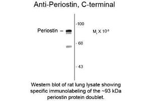 - The antibody is expected to work on all mammalian and avian species. Specific for the ~93 kDa periostin doublet in mouse lung extract. Consistent with the fact that this antibody is made against an alternatively spliced region of periostin, this antibody recognizes only the largest two of the three forms of periostin recognized on Western blots by the Pan periostin antibody and also shows a distinctive staining pattern by immunohistochemistry.