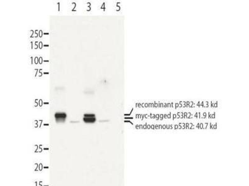 Application Note: RRM2B/p53R2 antibody is tested in Western Blot and ELISA and suitable for IP, IHC, and IF. Specific conditions for reactivity should be optimized by the end user. Expect a band approximately 41 kDa in size corresponding to RRM2B1 by western blotting in the appropriate cell lysate or extract.