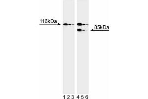 116 kDa (full-length), 85 kDa (cleaved)