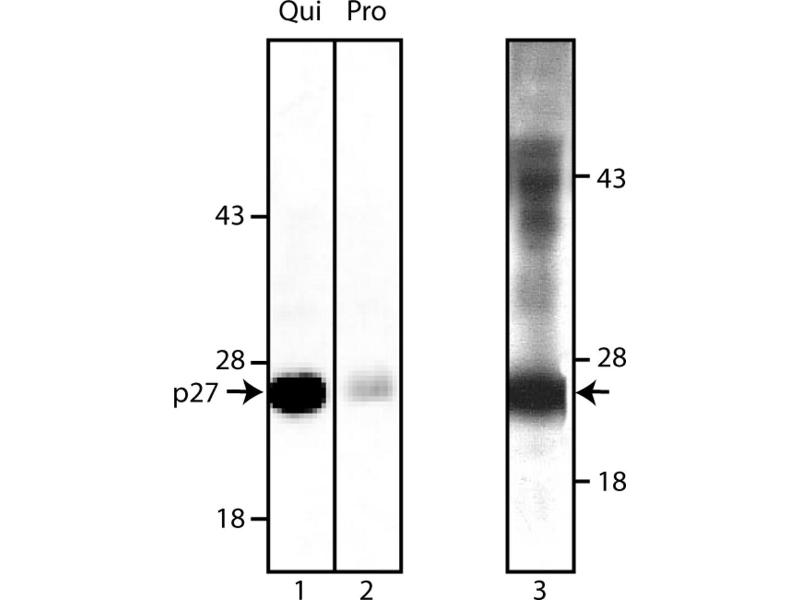 - Cyclins and cyclin-dependent kinases (cdks) are evolutionarily conserved proteins that are essential for cell-cycle control in eukaryotes. Cyclins (regulatory subunits) bind to cdks (catalytic subunits) to form complexes that regulate the progression of the cell cycle. These complexes are regulated by activating and inhibitory phosphorylation events, as well as by interactions with small proteins that bind to cyclins, cdks, or cyclin-cdk complexes. These include p15, p16, p18, p19, p21 and p27 [Kip1]. p27 [Kip1] has been shown to inhibit the activity of multiple cyclin-cdk complexes, including cyclin D-cdk4, cyclin E-cdk2 and cyclin A-cdk2. p27 [Kip1] is a 27 kD protein which shares N-terminal sequence homology with p21, and like p21, p27 [Kip1] contains a nuclear localization signal in its C-terminal region. IL-2 activation of T cells has been reported to lead to a decrease in p27 [Kip1] and entry into S phase. Removal of IL-2 from T cell cultures results in increased levels of p27 [Kip1] and cell quiescence.