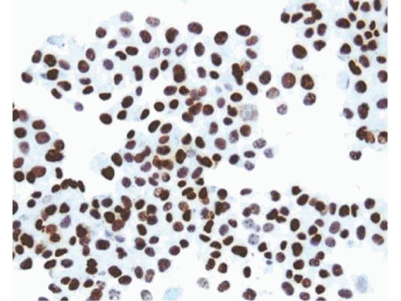 By SDS-PAGE, T-ag migrates at 90-100 kDa and t-ag at 15-20 kDa. COS-7 kidney monkey cells (ATCC CRL 1651), other established SV40-transformed cell lines, SV40-virus infected cells, or cells transfected with SV40 DNA should be used as a positive control. Other applications include immunoprecipitation, Western blot analysis, immunofluorescence microscopy, immunohistochemical staining of acetone-fixed, tissue culture cells (cytospin) and SV40 origin DNA binding assays, although this application has not been. The biotin-conjugated antibody, ABIN967413 is recommended for cytospin staining and IHC applications.