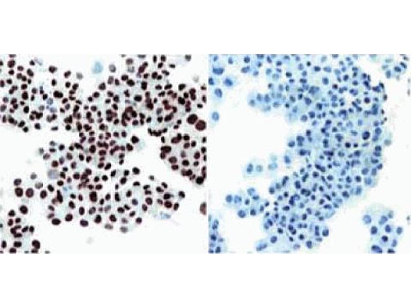 Simian virus 40 (SV40) is a small DNA virus encoded by 5.2 kb of double-stranded DNA. SV40 large T-antigen (T-ag) is a multifunctional ~85 kDa phosphoprotein, which is the sole viral protein required for SV40 replication. All other factors are provided by the infected host cell. In addition to its role in SV40 DNA replication, T-ag also causes transformation of susceptible cell lines. Studies of various mutant T-ag proteins have shown that the replication and transformation fractions of T-ag can be separated. The multifunctional nature of this protein has resulted in its use as a model system in a wide variety of disciplines. T-ag exercises negative regulation on the transcription of SV40 early mRNA by feedback inhibition and exerts positive regulation on transcription from the late promoter. In addition to transcriptional regulation, T-ag is involved in viral DNA replication. Specific biochemical functions required for DNA synthesis that are inherent to the T-ag include high-affinity binding to sites within the viral origin of DNA synthesis, ATPase, and helicase activities. Other functions attributed to T-ag include cellular transformation, induction of cellular DNA synthesis, induction of rRNA synthesis, and provision of a host-range function for viral replication. However, functions of T-ag are influenced by a wide range of post-translational modifications including phosphorylation, glycosylation, acetylation, acylation, and adenylation. T-ag exists in monomeric as well as polymeric forms, and associates with the tumor suppressor proteins p53 and retinoblastoma protein (Rb). Most of T-ag is transported to the nucleus, while a small fraction is localized at the cell surface. Small t-Ag is a polypeptide which shares 82 N-terminal amino acids with large T antigen and has a unique C-terminal region. Clone PAb 108 recognizes an N-terminal epitope within the first 82 amino acids of T-ag and small t antigen (t-ag). B4 SV40-transformed BALB/c mouse fibroblasts were used as immunogen. PAb 108 was originally produced and characterized as part of a panel of antibodies designated PAb 102-117.