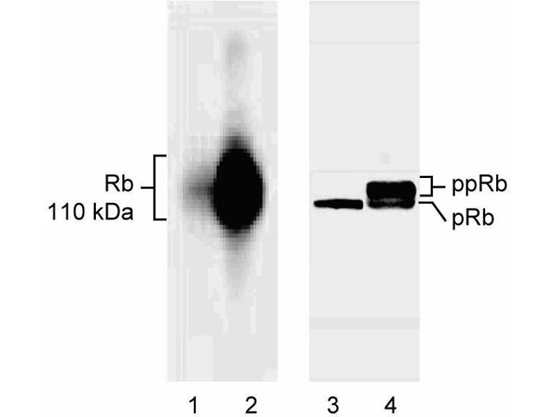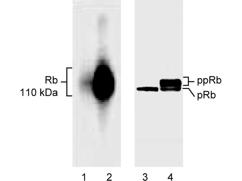 Applications include immunoprecipitation at 1-2 µg/one million cells. Rb migrates as multiple, closely-spaced bands between approximately 110-116 kDa when sized on denaturing polyacrylamide gels (i.e. by SDS/PAGE). The multiple bands represent different Rb phosphorylation states, the higher molecular weight bands are more highly phosphorylated than the lower molecular weight bands. The level of phosphorylation is cell cycle dependent, and may also be cell type dependent (not all forms are seen in all cell types that express Rb). Gel conditions influence the actual number of bands observed. In cases where optimal band separation is desired, use a 7 to 10% non-gradient long (at least 12 inches) gel. MOLT-4 human leukemia cells (ATCC CRL-1582) are suggested as a positive control.