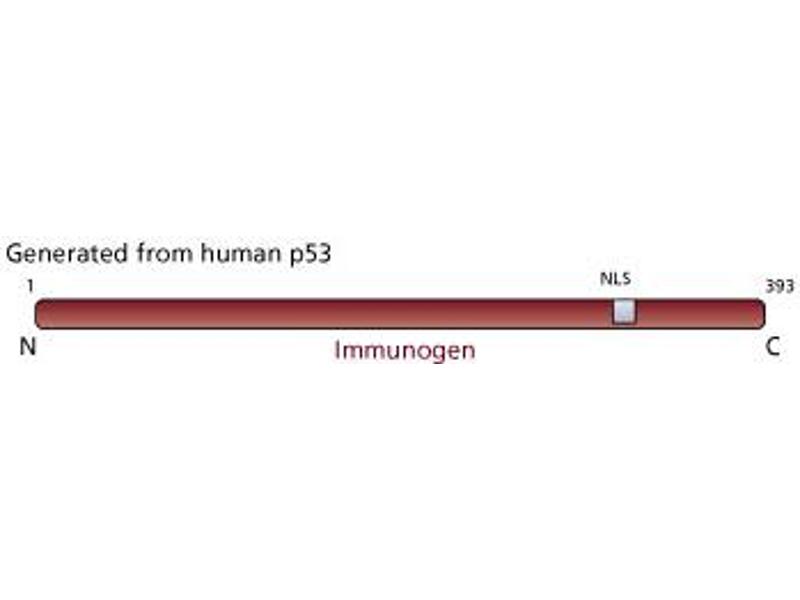 - The gene for the nuclear phosphoprotein p53 is the most commonly mutated gene yet identified in human cancers. Missense mutations occur in tumors of the colon, lung, breast, ovary, bladder and several other organs. The mutant p53 is over-expressed in a variety of transformed cells and it forms specific complexes with several viral oncogenes including SV40 large T, E1B from adenovirus and E6 from human papilloma virus. Recent data suggest that wild type p53 plays a role as a checkpoint protein for DNA damage during the S-phase of the cell cycle. However, it is still unclear whether point mutated forms of p53 are simple null mutants and/or dominant negatively acting proteins. p53 migrates at a reduced molecular weight of 53 kDa. Clone PAb 1801 recognizes an epitope between amino acids 32-79 in the N-terminal domain of human wild type and mutant p53 antibody. It does not cross-react with p53 from other species. A truncated recombinant human p53 fusion protein was used as immunogen.