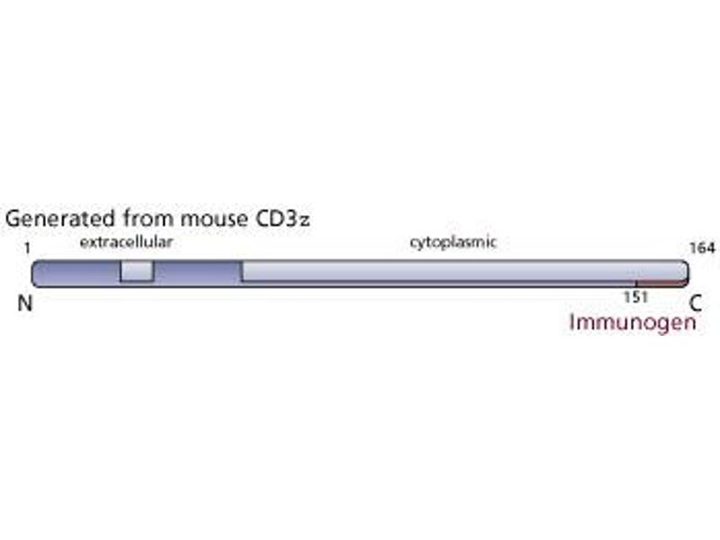 The T-cell receptor (TCR), expressed by thymus-derived lymphocytes, is a multicomponent complex responsible for recognizing antigen in the context of MHC molecules. Ti is the antigen-specific binding component of the TCR. On the majority of peripheral T lymphocytes, Ti is present as a disulfide-linked alpha-beta heterodimer. A minor fraction express Ti as a gamma-delta heterodimer. The Ti subunits are Ig-like, each containing V and C regions. Ti is noncovalently associated with an invariant set of molecules referred to as the CD3 subunits. CD3 appears early in thymocyte differentiation and remains expressed on all mature T lymphocytes. In the mouse, it consists of five chains: gamma, delta, epsilon, zeta, and eta. The relative masses of the mouse CD3 chains are 21, 28, 26, 32, (dimer) and 21 kDa, respectively. Clone 1zeta3A1 recognizes an epitope in the C-terminus of mouse CD3zeta. A synthetic peptide corresponding to the C-terminus of mouse CD3zeta (BSACDTYDALHMQTLAPR) was used as immunogen. Hybridomas were derived from Balb/c spleen cells x NS-1.