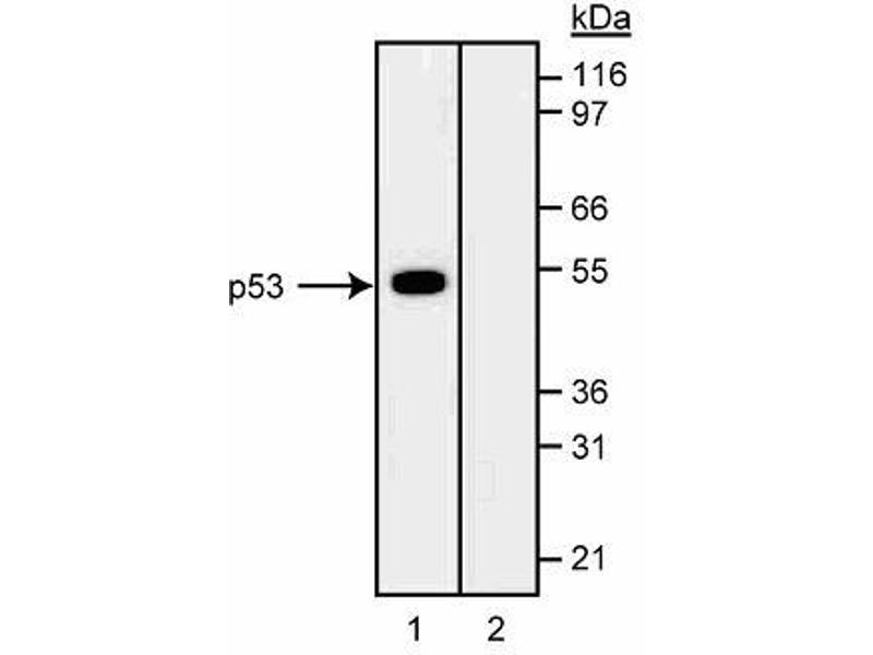 - P53 is a 53 kD nuclear phosphoprotein that acts as a tumor suppressor protein, and is involved in inhibiting cell proliferation when DNA damage occurs. The gene for p53 is the most commonly mutated gene yet identified in human cancers. Missense mutations occur in tumors of the colon, lung, breast, ovary, bladder and several other organs. The mutant p53 is overexpressed in a variety of transformed cells and wildtype p53 forms specific complexes with several viral oncogenes including SV40 large T, E1B from adenovirus, and E6 from human papilloma virus. Wildtype p53 plays a role as a checkpoint protein for DNA damage during the G1/S-phase of the cell cycle. However, it is still unclear, whether point mutated forms of p53 are simple null mutants and/or dominant negatively acting proteins. The DO-7 antibody recognizes human wildtype and mutant p53. It cross-reacts with bovine p53 but does not cross-react with mouse or rat p53. DO-7 recognizes an epitope between amino acids 1-45 of known forms of human p53. Human recombinant p53 protein was used as immunogen. Wildtype 53 proteins have a very short half-life and are usually not detectable with monoclonal antibodies (mAbs) in normal tissues.