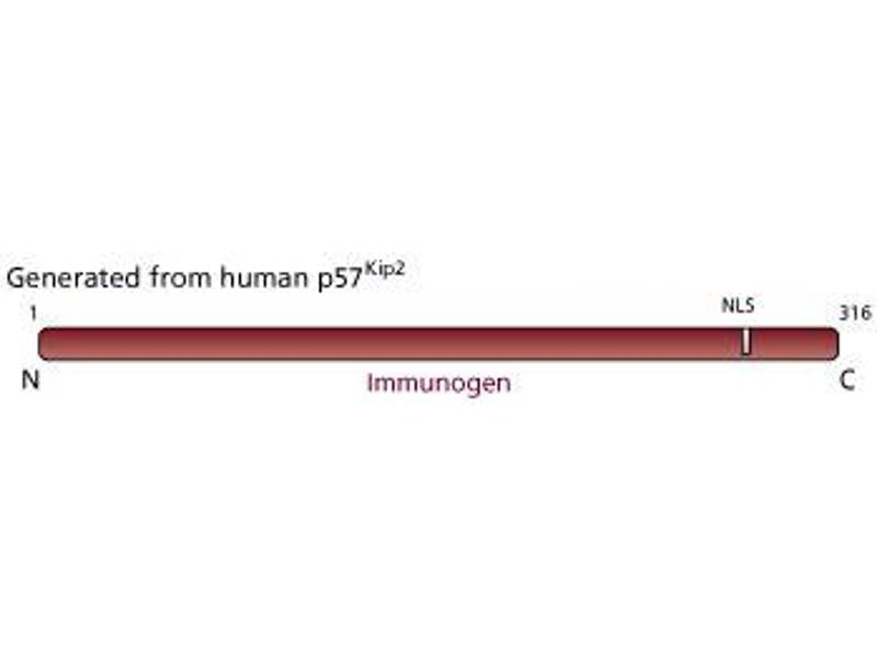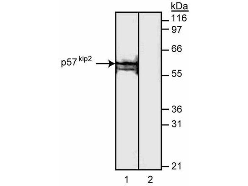 - Cyclin dependent kinase inhibitors (CdkIs) inhibit progression through the cell cycle by binding to cyclins, Cdks, or cyclin-Cdk complexes. CdkIs are classified into two groups based on protein structure. p57[Kip2] belongs to a group that also includes p27[Kip1] and p21 (also known as Sdi1, Cip1, Waf1 and Pic1). Members of this group have a homologous amino-terminal Cdk inhibitory domain. Members of the second group [p16 (INK4A), p15 (INK4B), p18 (INK4C), and p19 (INK4D)] contain ankyrin repeat motifs. p57[Kip2] is a potent, tight-binding inhibitor of several G1 and S phase cyclin-Cdk complexes including cyclin E-Cdk2, cyclin D2-Cdk4, and cyclin A-Cdk2. It inhibits the mitotic cyclin B1-Cdk1 complex to a lesser extent. mRNA studies suggest that p57[Kip2] expression is tissue-specific, the highest levels have been found in embryonic and adult skeletal muscle, heart, kidney, lung, eye and brain. This is in contrast to the widespread tissue expression of p27[Kip1] and p21 mRNA. The expression of p57[Kip2] to primarily terminally differentiated cells suggests that p57[Kip2] may play a specialized role in cell cycle control. Clone A120-1 reacts with human p57[Kip2]. Recombinant human p57[Kip2] was used as immunogen.