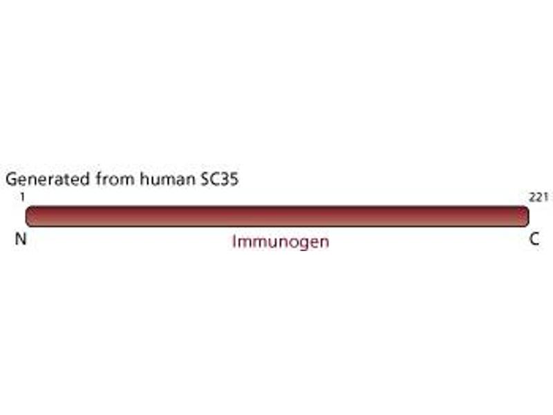 - SC35 belongs to a highly conserved SR splicing factor family. Members of this family have characteristic RNA-binding domains and serine/arginine-rich (SR) motifs. SR proteins are expressed in the nucleus and are essential pre-messenger RNA splicing factors. Nuclear pre-messenger RNA takes place in spliceosomes, multicomponent complexes consisting of five small nuclear ribonucleoprotein particles (U1, U2, U4, U5, U6) and other non-snRNP factors such as SC35. SC35 is necessary for an early step in spliceosome assembly and can also influence the selection of alternative splice sites. SC35 is identified as a 35 kDa protein in SDS/PAGE. Clone alphaSC35 has been shown to recognize SC35 in human, and rat cells. However, it should recognize SC35 from any species, as SC35 is conserved from Drosophila to man. Partially purified spliceosomes were used as immunogen.