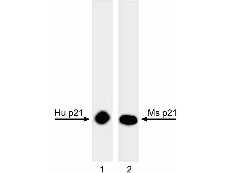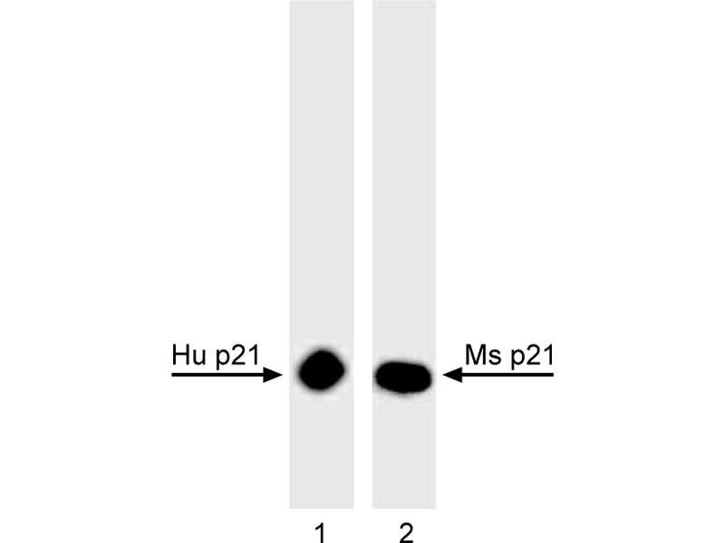 - Cyclins and cyclin-dependent kinases (cdks) are evolutionarily conserved proteins that are essential for cell-cycle control in eukaryotes. Cyclins (regulatory subunits) to form complexes that regulate the progression of the cell cycle. The activity of these complexes is modulated by activating and inhibitory phosphorylation events, as well as by interactions with small regulatory proteins including, p16, p21, p27 and others. These proteins, referred to as inhibitors of Cdk activity (CDkIs) bind to cyclins, cdks or their complexes. p21, also known as senescent cell-derived inhibitor 1 (Sdi1), wild-type p53-activated fragment 1 (Waf1), Cdk-interacting protein 1 (Cip1), and p53-regulated inhibitor of Cdks (Pic1) inhibits cyclin D-cdk4, cyclin E-cdk3, cyclin A-cdk2, and cyclin A-cdk1. p21 can also inhibit cell cycle progression by binding to PCNA and blocking DNA replication. p21 has also shown to be a component of active cyclin-cdk complexes, suggesting that p21-containing complexes may shift between active and inactive states through changes in p21 content. Active, p21-containing complexes appear to contain one p21 molecule, whereas inactive complexes contain multiple p21 molecules. The expression of p21 can be induced in response to number of signals, including transcriptional upregulation by the tumor suppressor protein, p53. Human p21 has a calculated molecular weight of 18 kDa and runs at 21 kDa in SDS-PAGE. The epitope has been mapped to the last 20 amino acids (residues 145-164) of human p21, one of the most conserved regions between human and mouse p21. Reaction of the antibody with overlapping peptides fragments suggest that the epitope may be further mapped to residues 145-156 (TSMTDFYHSKRR). This sequence overlaps with the sequence of p21 (KRRQTSMTDFYH) which is responsible for the specific interaction of p21 with PCNA. This antibody is routinely tested by western blot analysis.