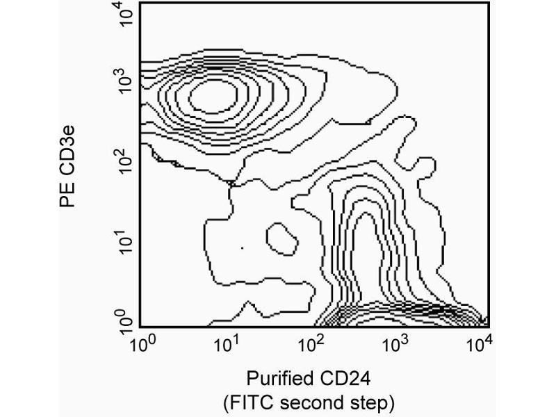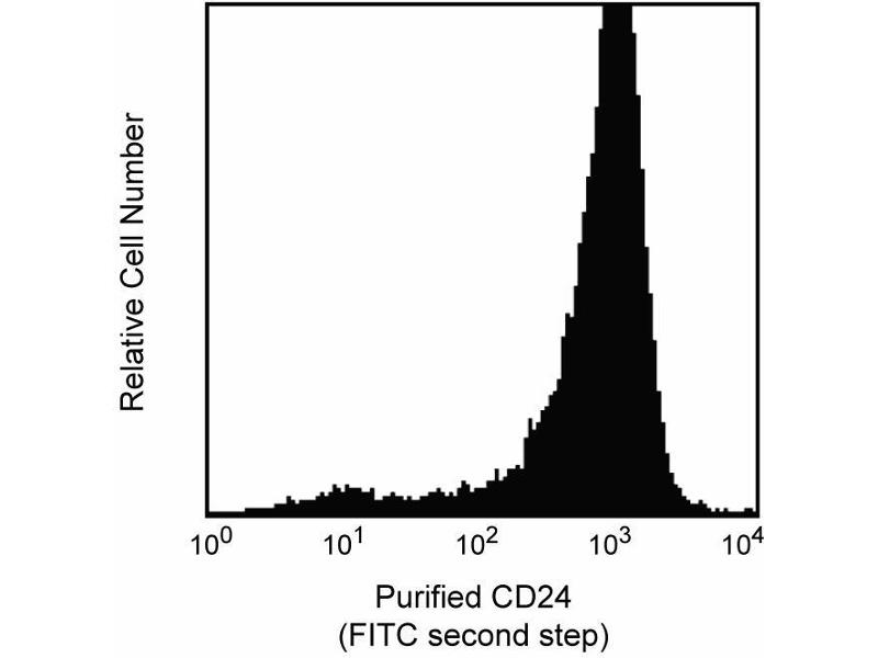 The M1/69 antibody reacts with CD24 (Heat-Stable Antigen, HSA or HsAg), a variably glycosylated GPI-anchored membrane protein found on erythrocytes, granulocytes, monocytes, lymphocytes, and neurons. Hematopoietic stem cells of the embryonic yolk sac and fetal liver express CD24.5 Levels of expression of CD24 vary during differentiation of the T and B cell lineages. In the bone marrow, hematopoietic progenitors acquire CD24 expression upon commitment to the B-lymphocyte lineage. Immature B cells in the bone marrow and spleen of adult mice peripheral B lymphocytes express intermediate levels of CD24. The level of CD24 expression has been reported to rise upon activation of splenic B cells with LPS, but not with CD154 (CD40 Ligand). The majority of thymocytes express high levels of CD24, while most mature thymic and peripheral T lymphocytes do not express CD24. In contrast, TCR-bearing thymocytes which emigrate to the spleen are CD24+. Dendritic cells of the thymus, spleen, liver, and epidermal Langerhans cells have also been reported to express CD24. CD24 is not expressed by NK cells, as determined by staining with J11d mAb (ABIN967372). CD24 is involved in the costimulation of CD4+ T cells by B cells, it is a co-inducer of in vitro thymocyte maturation, and it is a ligand of CD62P (P-selectin). While the monoclonal antibodies 30-F1, M1/69, and J11d all react with CD24, they show subtle differences in the level of staining of different lymphocyte populations. When possible, investigators should continue to use the same monoclonal antibody as used in previous studies. This antibody is routinely tested by flow cytometric analysis.