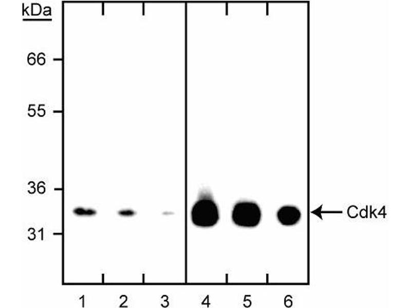 Cyclins, cyclin-dependent kinases (Cdks), and cyclin-dependent kinase inhibitors (CdkIs) are essential for cell-cycle control in eukarytotes. Cyclins, regulatory subunits, bind to cyclin-dependent kinases (Cdks), catalytic subunits, to form active cyclin-Cdk complexes. Cdk subunits by themselves are inactive and binding to a cyclin is required for their activity. Cyclins A, B1, D and E undergo periodic synthesis and degradation, thereby providing a mechanism to regulate Cdk activity throughout the cell cycle. Additionally, Cdk activity is further regulated by activating and inhibitory phosphorylations, and small proteins (p15, p16, p18, p19, p21 and p27), called inhibitors of Cdk activity, that bind to cyclins, Cdks, or cyclin- Cdk complexes. Cdk4 was originally called PSK-J3, and following demonstration of its association with D-type cyclins, became known as Cdk4. D-type cyclins also associate with Cdks 2 and 5, although Cdk4 appears to be the most abundant partner. The D-type cyclins (D1, D2, and D3) are expressed in response to growth factors or mitogens, and rapidly degrade when mitogens are withdrawn. D cyclins appear to promote G0 to G1 transitions and the rate of G1 progression. For example, cyclin D-Cdk4 and cyclin D-Cdk6 complexes phosphorylate the retinoblastoma protein (Rb) which removes the G1 phase block caused by underphosphorylated Rb. Cdk4 has a molecular weight of ~32 kD. Clone DCS-156 recognizes human and mouse Cdk4. A recombinant protein fragment from the C-terminal end of human Cdk4 was used as immunogen.