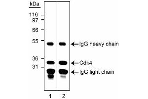 - Cyclins, cyclin-dependent kinases (Cdks), and cyclin-dependent kinase inhibitors (CdkIs) are essential for cell-cycle control in eukarytotes. Cyclins, regulatory subunits, bind to cyclin-dependent kinases (Cdks), catalytic subunits, to form active cyclin-Cdk complexes. Cdk subunits by themselves are inactive and binding to a cyclin is required for their activity. Cyclins A, B1, D and E undergo periodic synthesis and degradation, thereby providing a mechanism to regulate Cdk activity throughout the cell cycle. Additionally, Cdk activity is further regulated by activating and inhibitory phosphorylations, and small proteins (p15, p16, p18, p19, p21 and p27), called inhibitors of Cdk activity, that bind to cyclins, Cdks, or cyclin- Cdk complexes. Cdk4 was originally called PSK-J3, and following demonstration of its association with D-type cyclins, became known as Cdk4. D-type cyclins also associate with Cdks 2 and 5, although Cdk4 appears to be the most abundant partner. The D-type cyclins (D1, D2, and D3) are expressed in response to growth factors or mitogens, and rapidly degrade when mitogens are withdrawn. D cyclins appear to promote G0 to G1 transitions and the rate of G1 progression. For example, cyclin D-Cdk4 and cyclin D-Cdk6 complexes phosphorylate the retinoblastoma protein (Rb) which removes the G1 phase block caused by underphosphorylated Rb. Cdk4 has a molecular weight of ~32 kD. Clone DCS-156 recognizes human and mouse Cdk4. A recombinant protein fragment from the C-terminal end of human Cdk4 was used as immunogen.