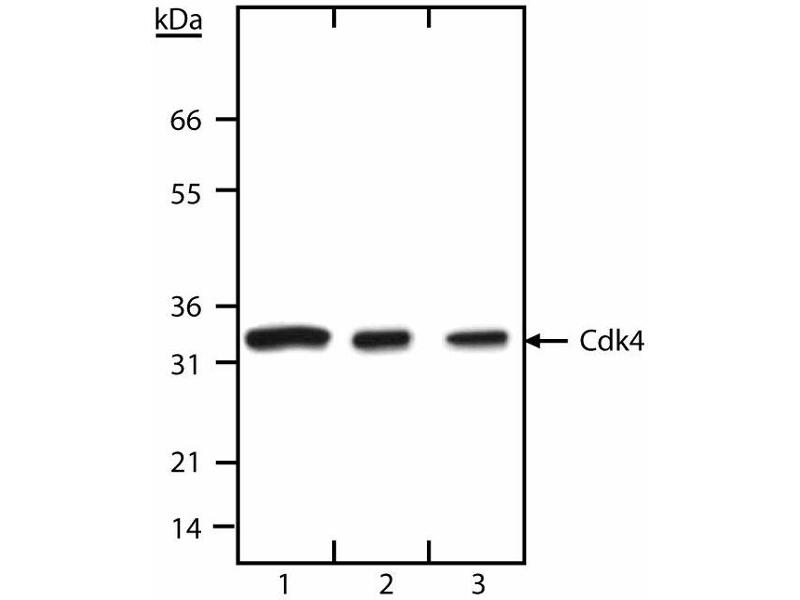 - Cyclins, cyclin-dependent kinases (Cdks), and cyclin-dependent kinase inhibitors (CdkIs) are essential for cell-cycle control in eukaryotes (reviewed in 1). Cyclins, regulatory subunits, bind to cyclin-dependent kinases (Cdks), catalytic subunits, to form active cyclin-Cdk complexes. Cdk subunits by themselves are inactive and binding to a cyclin is required for their activity. Cyclins A, B1, D and E undergo periodic synthesis and degradation, thereby providing a mechanism to regulate Cdk activity throughout the cell cycle. Additionally, Cdk activity is further regulated by activating and inhibitory phosphorylations, and small proteins (p15, p16, p18, p19, p21 and p27), called CdkIs, that bind to cyclins, Cdks, or cyclin-Cdk complexes. Cdk4 was originally called PSK-J3,2 and following demonstration of its association with D-type cyclins, became known as Cdk4.2 D-type cyclins also associate with Cdks 2 and 5, although Cdk4 appears to be the most abundant partner. The D-type cyclins (D1, D2, and D3) are expressed in response to growth factors or mitogens, and rapidly degrade when mitogens are withdrawn. D cyclins appear to promote G0 to G1 transitions and the rate of G1 progression. For example, cyclin D-Cdk4 and cyclin D-Cdk6 complexes phosphorylate the retinoblastoma protein (Rb) which removes the G1 phase block caused by underphosphorylated Rb. Cdk4 has a molecular weight of ~33 kD.