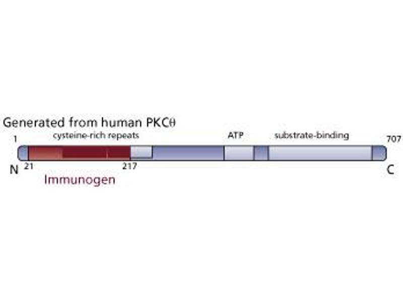 - The Protein Kinase C (PKC) family of homologous serine/threonine protein kinases is involved in a number of processes, such as growth, differentiation, and cytokine secretion. At least eleven isozymes have been described. These proteins are products of multiple genes and alternative splicing. PKC consists of a single polypeptide chain containing four conserved regions (C) and five variable regions (V). The N-terminal half containing C1, C2, V1, and V2 constitutes the regulatory domain and interacts with the PKC activators Ca2+, phospholipid, diacylglycerol, or phorbol ester. However, the novel PKC (nPKC) subfamily members (delta, epsilon, eta, and theta isoforms) and the atypical PKC (aPKC) subfamily members (zeta, iota, and lambda isoforms) are Ca2+-independent and lack the C2 domain. The aPKC members are unique in that their activity is independent of diacylglycerols and phorbol esters. They also lack one repeat of the cysteine-rich sequences that are conserved in cPKC and nPKC members. The C-terminal region of PKC contains the catalytic domain. The PKC pathway represents a major signal transduction system that is activated following ligand-stimulation of transmembrane receptors by hormones, neurotransmitters, and growth factors. PKCtheta transcripts are expressed in most tissues with the highest levels being found in hematopoietic tissues and cell lines, including T cells and thymocytes. PKCtheta mRNA is readily detectable in skeletal muscle, lung and brain. However, PKCtheta expression is not detected in several human carcinoma cell lines. Abundant expression of this PKC isozyme in hematopoietic cells suggest that it may have a role in growth and differentiation processes of these cells. This antibody is routinely tested by western blot analysis.