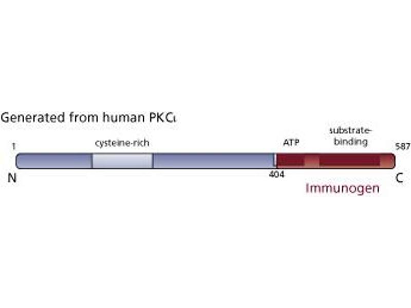 - The Protein Kinase C (PKC) family of homologous serine/threonine protein kinases is involved in a number of processes such as growth, differentiation, and cytokine secretion. At least eleven isozymes have been described. These proteins are products of multiple genes and alternative splicing. PKC consists of a single polypeptide chain containing four conserved regions (C) and five variable regions(V). The N-terminal half containing C1, C2, V1, and V2 constitutes the regulatory domain and interacts with the PKC activators Ca 2+, phospholipid, diacylglycerol, or phorbol ester. However, the novel PKC (nPKC) subfamily members (delta, epsilon, eta, and theta isoforms) and the atypical PKC (aPKC) subfamily members (zeta, iota, and lambda isoforms) are Ca2+ independent and lack the C2 domain. The aPKC members are unique in that their activity is independent of diacylglycerols and phorbol esters. They also lack one repeat of the cysteine-rich sequences that are conserved in cPKC and nPKC. The C-terminal region of PKC contains the catalytic domain. The PKC pathway represents a major signal transduction system that is activated following ligand-stimulation of transmembrane receptors by hormones, neurotransmitters, and growth factors. PKCiota was isolated from a human kidney cDNA library. It is highly expressed in brain and lung, but it is also seen in many other tissues at lower levels. PKCiota shows the most similarity to PKCzeta , 72% overall identity. These two enzymes share a highly conserved pseudosubstrate sequence, the absence of a Ca2+-binding region, and the presence of only one zinc finger-like domain. It is thought that PKCiota has a role in the secretory response to nutrients. This antibody is routinely tested by western blot analysis.