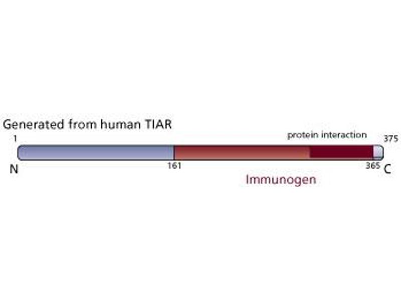 - TIAR is an RNA-binding protein related to TIA-1. Both proteins are candidate effectors of apoptotic cell death and consist of three N-terminal RNA-recognition motifs (RRM) and a C-terminal protein-interaction domain (PID). Unlike TIA-1, which is localized in the granules of cytotoxic lymphocytes, TIAR is predominantly found in the nucleus of many different cell types. Two related isoforms (42 kDa and 50 kDa) of TIAR have been identified. It has been demonstrated that TIAR can trigger DNA fragmentation in permeabilized thymocytes, suggesting that it may be an effector of apoptotic cell death. During Fas-mediated apoptosis, TIAR shows a rapid translocation from the nucleus to the cytoplasm. This redistribution of TIAR appears to be a specific event and possibly a general feature of the apoptotic program.