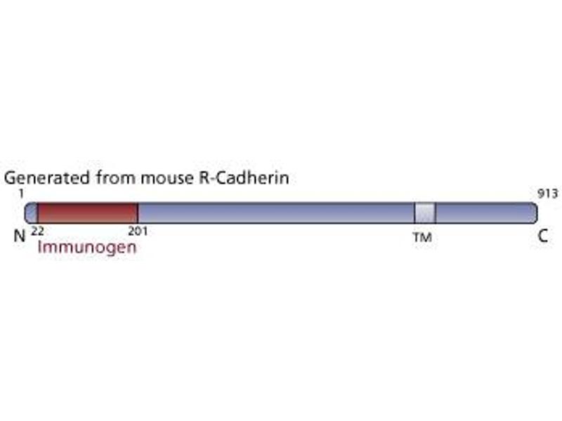 - R-Cadherin was first isolated from chicken retina, but was subsequently shown to be present and highly conserved in a variety of tissues from several different species. A 913 amino acid polypeptide, R-Cadherin is highly homologous to Cadherin-4, but is most closely related to another family member, N-Cadherin. In experiments using chimeric L cells expressing chicken or mouse Cadherins, those cells expressing mouse or chicken R-Cadherin were able to aggregate with each other as well as with cells expressing N-Cadherin. However, there was no aggregation of R-Cadherin expressing cells, with P- or E-Cadherin expressing cells. This suggests that the roles of specific cadherins are conserved among types in the determination of heterogenous cell segregation and distribution during tissue morphogenesis and maintenance.