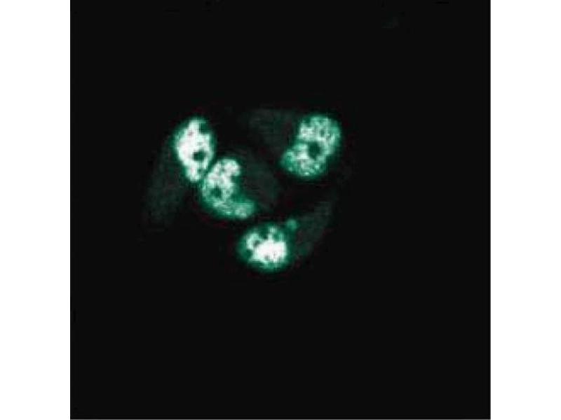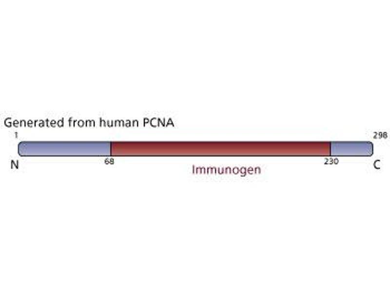 Progression of the mammalian cell cycle is regulated in two different ways: 1) phosphorylation and dephosphorylation of key proteins, 2) synthesis and degradation of regulatory factors. The Proliferating Cell Nuclear Antigen (PCNA) was initially identified as a nuclear antigen in proliferating cells and was subsequently described as a subunit for DNA polymerase delta. Human PCNA is 262 amino acids with an apparent molecular weight of 36 kDa. PCNA protein levels peak during the S-phase of the cell cycle, at which time it forms a complex with the p21 inhibitor. PCNA is almost undetectable in other phases of the cycle. Because of its unique expression, PCNA has been extensively used in studies associating the prognosis of tumor progression and neoplastic proliferation.