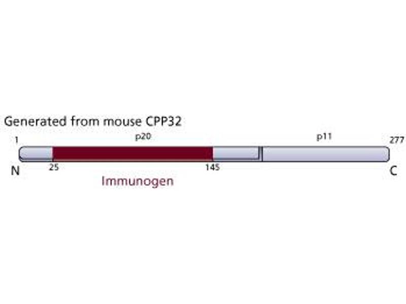 Apoptosis, a selective process of genetically programmed cell death, occurs during normal cellular differentiation and development of multicellular organisms. Apoptotic cells are characterized by loss of cell volume, plasma membrane blebbing, nuclear condensation, chromatin aggregation, and endonucleocytic degradation of DNA into nucleosomal fragments. Caspase-3 (CPP32, Yama, apopain) is a member of the family of cysteine proteases which includes interleukin-1beta-converting enzyme (ICE) and C. elegans protein, Ced-3. An apoptotic signal such as granzyme B of cytotoxic T-cells (CTLs) or ICE-like proteases induces the intracellular cleavage of Caspase-3 from the inactive proform (32kDa) to the active form which consists of the p20, p17, and p12 subunits. The active form of Caspase-3 cleaves several other apoptotic proteins including proteins such as DNA fragmentation factor (DFF). Apoptosis can be inhibited by coexpression of Bcl-2 as well as inhibitors of Caspase-3 or other members of the family of cysteine proteases. This antibody recognizes the mouse 32 kDa pro-Caspase-3 and the p17 cleaved form of Caspase 3 in T cell lymphocytes treated with camptothecin.