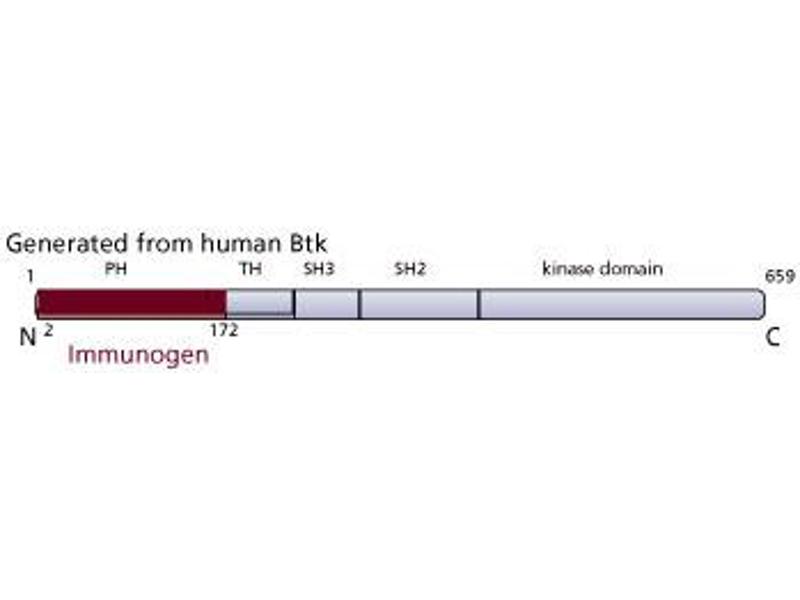 - Bruton's tyrosine kinase (Btk) is a nonreceptor tyrosine kinase whose function is critical for proper B cell development and signaling. It is a member of the Tec family of kinases which includes Tec and Itk. This family is similar to the src family of tyrosine kinases. However, Tec family members lack the N-terminal myristylation site and the regulatory C-terminal tyrosine that are found in src proteins. In addition to an N-terminal pleckstrin homology (PH) domain, the Tec proteins contain Src homology domains 2 and 3 (SH2 and SH3) and a stretch of 60-80 amino acids between the PH and SH3 domains termed the Tec homology domain. The activity of Btk is regulated by Src-mediated phosphorylation of the kinase domain at tyrosine 551. This event induces Btk kinase activity and subsequent autophosphorylation at tyrosine 223 in the SH3 domain. Phosphorylated Btk then associates with the cell membrane via the interaction of the PH domain with phosphatidylinositol 3, 4, 5-triphosphate. The PH domain is essential for proper activation and function of Btk. A mutation in the PH domain results in Xid, murine X-linked immunodeficiency, and human X-linked agammaglobulinemia.