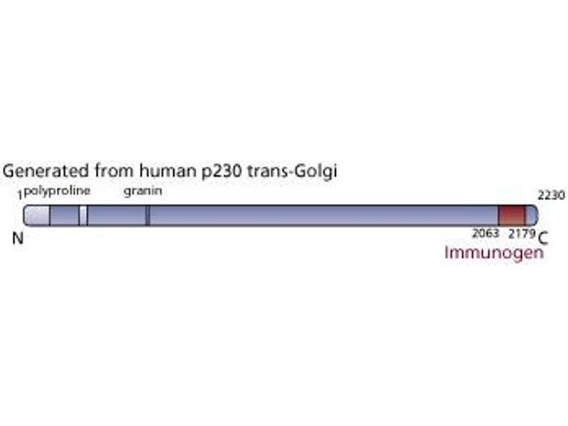 - The Golgi apparatus is a very complex and dynamic organelle that functions in protein sorting and modification. Numerous structural and regulatory proteins are involved in the budding, docking, and fusion of Golgi-directed vesicles. p230 trans Golgi is a peripheral membrane protein associated with the cytosolic face of the trans Golgi network (TGN). Protein sequence analysis indicates that it is highly hydrophilic and contains two proline-rich regions, as well as a high frequency of heptad repeats which are characteristic of alpha-helices that form dimeric coiled-coiled structures. Additionally, p230 trans Golgi contains a ESLALEELEL sequence, a motif of the acidic granin proteins that are found in secretory granules of neuroendocrine cells. p230 trans Golgi cycles between the cytosol and the TGN via non-clathrin coated vesicles in a G protein-dependent manner. The localization of p230 trans Golgi to the TGN is dependent on aromatic residues in its C-terminal non-coiled coil domain. Thus, p230 trans-Golgi is aTGN-specific protein that is important for the biogenesis of distinct populations of non-clathrin coated vesicles and, thus, functions in vesicular transport from the TGN. This antibody is routinely tested by western blot analysis.