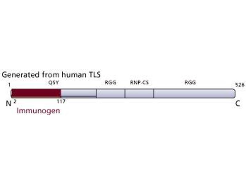 - Chromosomal translocations in leukemias and malignancies of non-hematopoietic tissues usually result in the fusion of genes and the production of novel fusion proteins. Translocated in liposarcoma (TLS/FUS) was identified through its fusion to the transcription factor CHOP in human myxoid liposarcoma. In addition, the fusion of TLS to the transcription factor ERG is involved in human acute myeloid leukemia. TLS contains an N-terminal Gln-, Ser-, and Tyr-rich region (QSY) that is thought to be a potent transactivator when fused with transcription factors. In its C-terminus, TLS contains a ribonucleoprotein consensus sequence (RNP-CS) and Arg-Gly-Gly (RGG) repeats that have been implicated in RNA binding. This feature allows it to function in shuttling of RNA from the nucleus. TLS also interacts with Ser-Arg proteins that regulate RNA splicing. Interestingly, TLS also interacts with the DNA binding domains of the estrogen, thyroid hormone, and glucocorticoid receptors. Thus, TLS is a multifunctional protein that is involved in RNA transport, nuclear receptor function, and gene transactivation when fused with transcription factors. This antibody is routinely tested by western blot analysis.