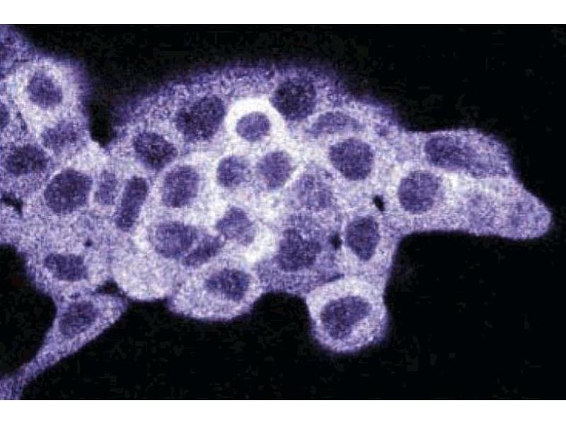 In culture, cell density can have profound effects on gene expression, enzymatic activity, and cell signaling pathways. Using differential screening of cDNAs from low-passage nontumorigenic teratocarcinoma cells versus high passage tumorigenic cells, a protein was identified that is regulated in cell-density dependent manner. This protein, density-regulated protein 1 (drp1), contains putative sites for N-myristoylation and phosphorylation sites for cAMP and/or cGMP-dependent kinase, casein kinase II, and PKC. The expression of drp1 is enriched in high density cultures of both nontumorigenic and tumorigenic cell lines and is widely detected in adult organs, especially skeletal and cardiac muscle. In addition, increased expression of drp1 is not due to growth arrest as a result of serum starvation or TGF-beta treatment nor is it a result of factors found in the media of high density cultures. Interestingly, drp1 is expressed highest in skeletal and cardiac muscle where unique cell-cell contacts are involved in muscle cell membrane depolarization and contraction. Thus, drp1 expression may be regulated by signaling pathways related to specific types of cell-cell contacts. This antibody is routinely tested by western blot analysis.